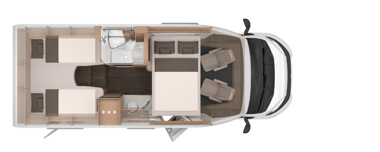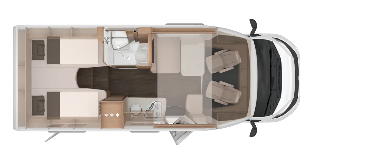 • Einfacher Zugang zu Gaskasten über Servicetür in der Seitenwand, Anordnung der Gasflaschen längs